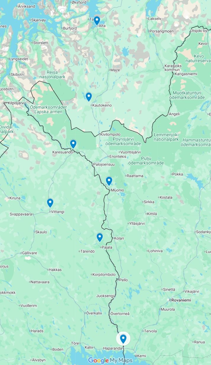 Den nya nordliga rutten. Tidigare gick posten efter gränsälven och Muonio. © Google maps