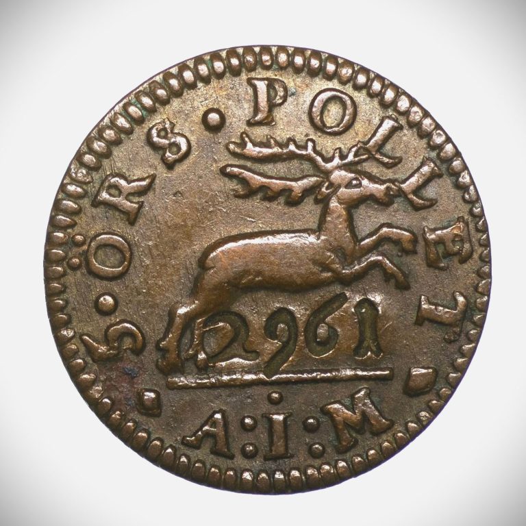 Den vänstra är en 5 öres myntpollett, 23 mm. Polletterna har monogrammet AIM, för Abraham och Jakob Momma, vilket gör att vi kan tidsbestämma dem till före år 1669. Det året adlas bröderna till Reenstierna. Myntpolletterna är enbart stämplade på framsidan, men det förekommer att de har sin numrering på baksidan. Märkt 2961.