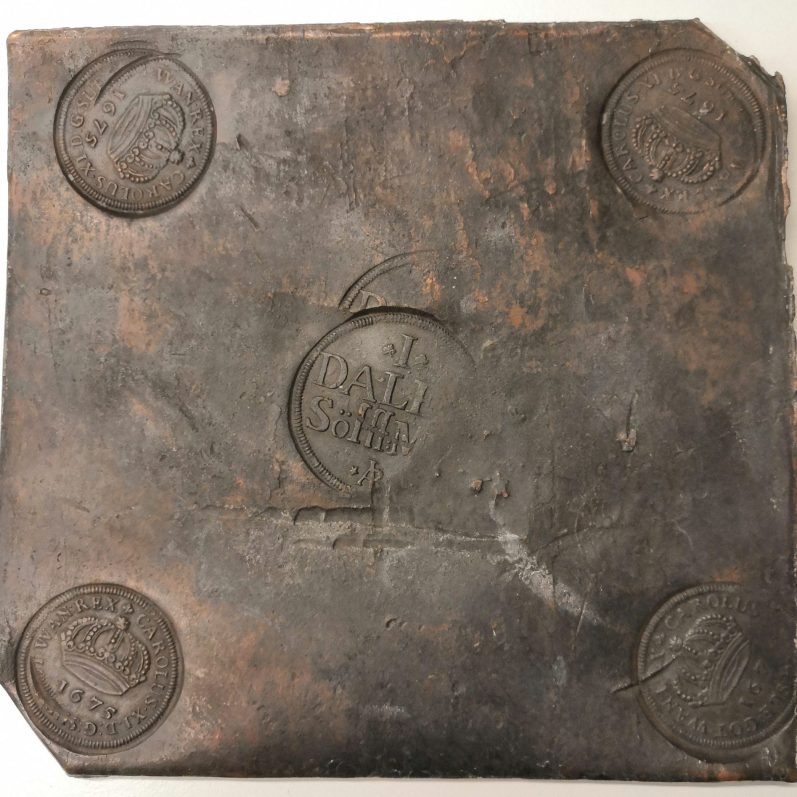Bild 3: Endalers plåtmynt stämplad i Kengis 1675. Monogrammet AIR i mitten under 1 daler silvermynt. I hörnen kronstämpel märkt Karl XI. Foto: Finlands Nationalmuseum.
