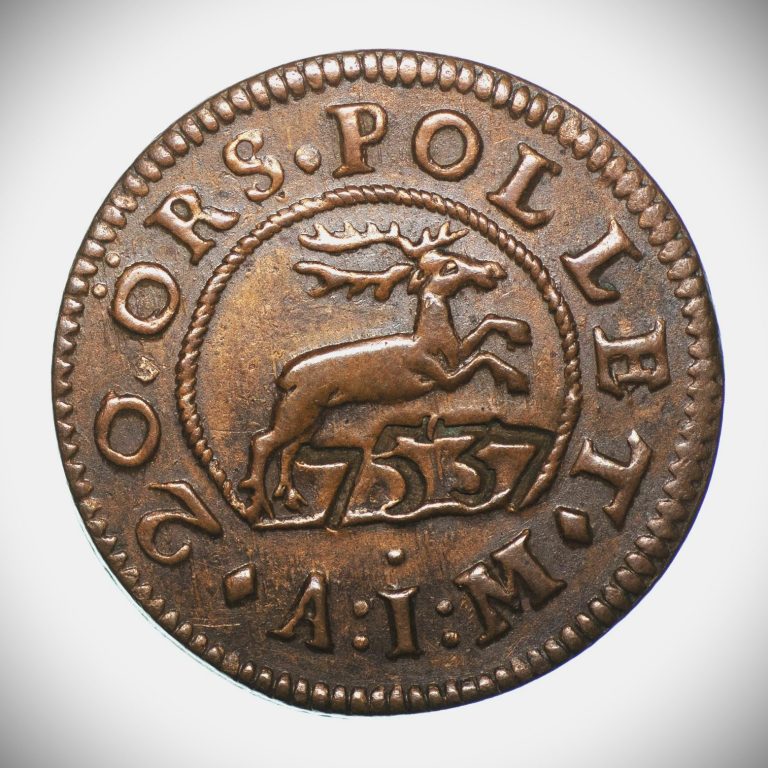 Den högra är en 20 öres myntpollett, 28 mm. Monogram AIM. Märkt 7537. Myntpolletterna börjar användas 1660. Efterhand börjar de numreras på grund av att förfalskningar dyker upp. De höga numren visar oss att det produceras många polletter.
