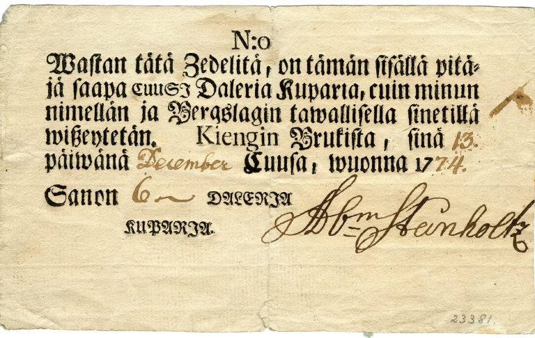 Bild 4: En sedel 6 daler kopparmynt 1774 från Kengis bruk. Foto: Ekonomiska museet.