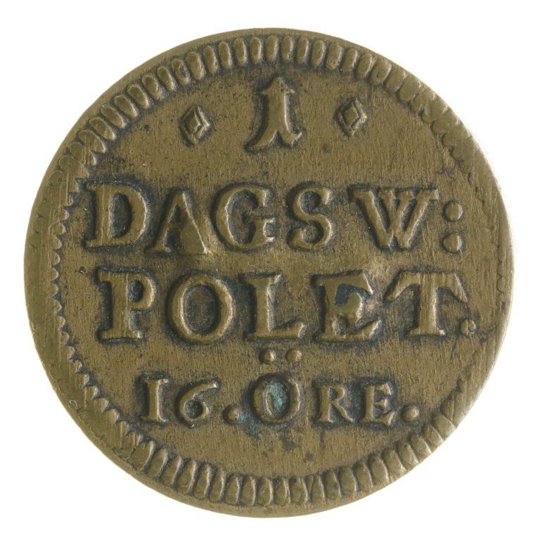 Den vänstra är på 16 öre, 23 mm. Den högra är på 20 öre, 22 mm. De är enbart stämplade på framsidan. Dagsverkspolletterna används från 1663. I maj 1666 tas det upp i rådhusrätten att det förekommer falska mässingspolletter. De första åren präglas polletterna av mässing, för att sedan uteslutande vara av koppar. Arendt Grape åtar sig i augusti samma år att lösa in alla mässingspolletter. Han utlyser även en belöning på 80 riksdaler, en hög summa, för att förfalskaren ska gripas. Ingen fälls dock för brottet. Få mässingspolletter finns kvar idag och förklaringen bör vara att de löstes in och ersattes med kopparpolletter.